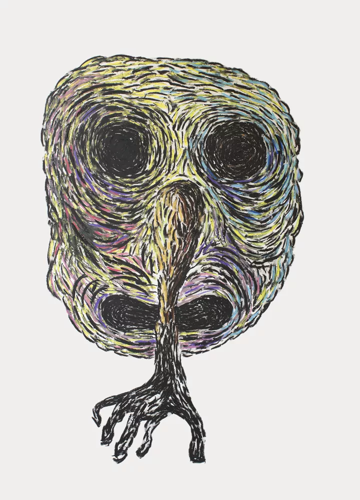 Conclusion and Then Rationalization (2017) shows a bulldozer on a white background. It is shaped like a toy with headlights for eyes. There’s no driver but instead a book with leather straps buckled to the radiator bonnet. An over-sized arm – the hand in a long, black glove – protrudes outwards and upwards from the side of the machine, from its engine compartment, and with a firm grip is swinging a withered foot – two toes missing – like a flag or projectile launcher. Real objects, portrayed by using colour (acrylic and oil pastel) in a picturesque rather than photorealistic fashion, and with clear contours, are put together in unrealistic ways. In the same way Frankenstein created his monsters, here too objects and body parts are assembled in distorted proportions and produce a nightmarish effect. The massive black fist looks brutal spinning the bare, severed, rotting foot around by its overhanging skin. Rather than being steered by a head, the arm’s action is associated with a machine with destruction and disposal functions. And rather than being operated by a human being, the bulldozer is controlled by a book of laws that is sealed by straps – which render it unalterable, or ineffective – and tightly screwed to the annihilation machine. This monster, which is comprised of disparate parts, and which appears to be moving out from the picture in our direction, thus becomes an inescapable threat. In Conclusion and Then Rationalization, Memed Erdener is lamenting “a demolition of a culture gathered in a thousand years”. The withdrawal of tradition past a surpassing disaster, in the words of Lebanese thinker Jalal Toufic, finds its equivalent in Erdener’s paintings in the fragmented, mutilated, fetishized representations of the human figure. It is about the loss of continuity, the curtailment of basic rights and the corruption of values. Another painting in this exhibition that we can use as evidence of the significance of the hand as a metaphor for state power is