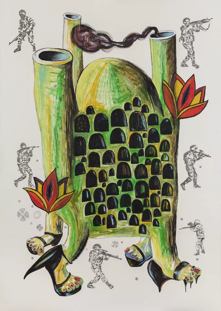 They Used A Girl Hitchhiker As the Decoy (2017), shows a green-yellow structure that on the one hand looks like a mosque with dome and minarets and on the other hand a factory with smoking chimneys; or a city model with a honeycomb of flats, although the organic shapes also make you think of living organisms, particularly the minarets, chimneys or pipes that lead into feet with painted toenails walking in a circle in stiletto heels. Red-yellow blossoms grow out of the pipes, the traditional tulip images corresponding to and symbolising the female power of attraction. Pencil-drawn soldiers in camouflage gear are visible as a background pattern around the colourful, clearly delineated foreground figure, the circular movement of which is echoed in the soldiers shooting in all directions. The story takes place on a single spot: the four feet are going round in a circle, so no new path is trodden. It is like a loop, a frozen idea, in Erdener’s words “a kind of bigotry”. The soldiers defend the status quo – and hamper progression.