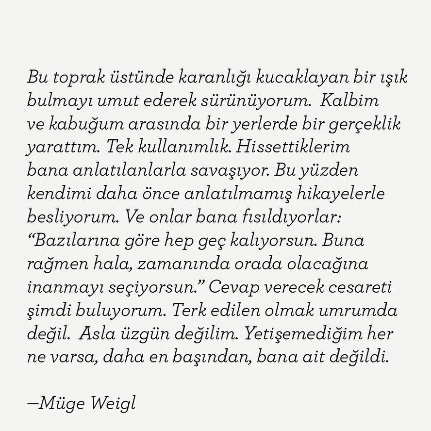 Bu toprak üstünde karanlığı kucaklayan bir ışık bulmayı umut ederek sürünüyorum. Kalbim ve kabuğum arasında bir yerlerde bir gerçeklik yarattım. Tek kullanımlık. Hissettiklerim bana anlatılanlarla savaşıyor. Bu yüzden kendimi daha önce anlatılmamış hikayelerle besliyorum. Ve onlar bana fısıldıyorlar: “Bazılarına göre hep geç kalıyorsun. Buna rağmen hala, zamanında orada olacağına inanmayı seçiyorsun.” Cevap verecek cesareti şimdi buluyorum. Terk edilen olmak umrumda değil. Asla üzgün değilim. Yetişemediğim her ne varsa, daha en başından, bana ait değildi.