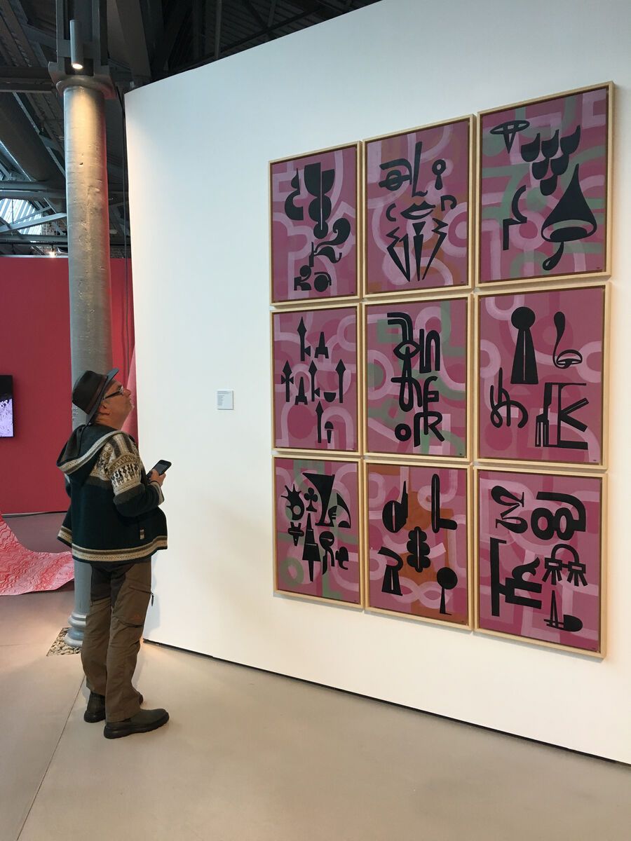 Bertan Şalmanlı, Artİstanbul Feshane'de “Ortadan Başlamak” adlı sergide, kaligrafik resmi inceliyor. (2023)