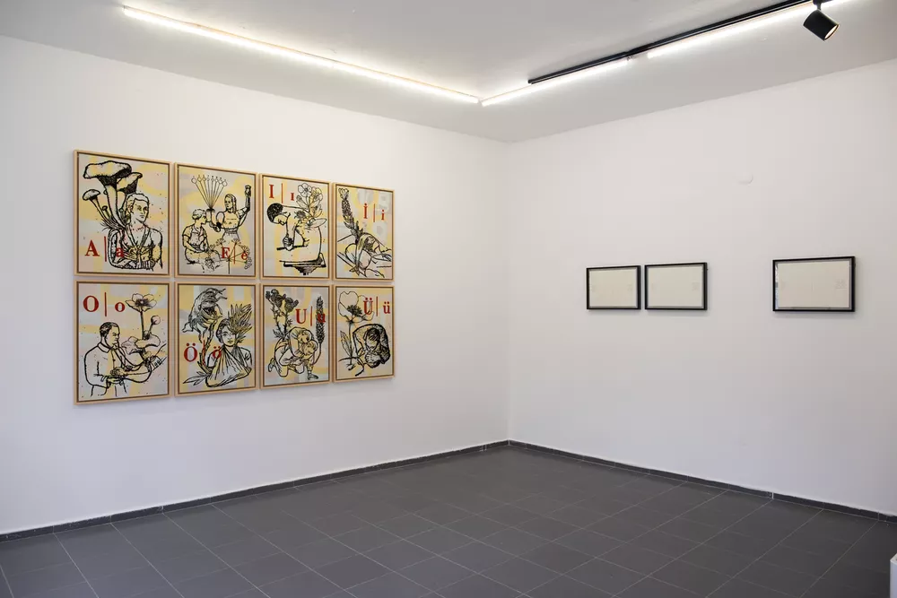 Seriye aynı zamanda, serginin ismini akla getirecek şekilde, Türkçenin sesli harfleri eşlik ediyor. Titreşimi yüksek, dudaklardaki hareketi büyük, takıntıya uğramadan bir sedaya dönüşebilen sesli harfler, başka bir açıdan, gündelik hayatımızın en primitif reaksiyonlarını oluşturur. Bu sekiz harf; şaşkınlığın, korkunun, tiksintinin, öfkenin ya da sevincin ifadesine tek başına bürünebilir. Bazen hafızanın bizi zorladığı, kelimeleri aradığımız gergin bir konuşmanın boşluklarını doldurup, asalak sesler olarak ağzımızdan çıkabilir. Cümlelerin bittiği yerde tek başına bir anlam yaratıp sessizliği bozabilir. Bilindik kelimelerin olmadığı, her şeyin adının yok olduğu verisiz bir dünyada, elimizde kalacak yalnız yine bu harfler olacaktır belki. Hala şaşırmak, tiksinmek, korkmak ve sevinmek bir şekilde var olacaktır ne de olsa. Hiç değilse bir çığlık, yankı yapan bir feryat.