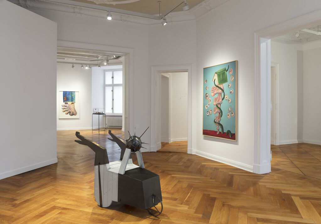 Erdener’s artistic process is based on the linking of individual parts, each one a pars pro toto, symbolic of a larger mental and emotional context. A doll’s arm stands for a doll, small person, toy, as well as fragility; horns stand for the assertion of priority; and (sound) funnels for enforced initial or output support. Each individual part of this type of collage featuring ready-made items and fragments is a cipher that, in connection and association with other ciphers, constitutes a new and mostly critical, ironic meaning. Erdener’s style brings together Surrealist and Pop Art characteristics. Alienation, combinatorics and metamorphosis, which are associated with Surrealism’s basic principles, are the characteristics of Erdener’s works, as are elements that can be seen in Philip Guston’s late paintings with their very dark pictorial motifs, e.g. the hoods of the Ku Klux Klan. This secret society was a threat to Guston’s Russian-Jewish family in 1930s and 1940s California. His portrayal of it nonetheless has humorous features to it.