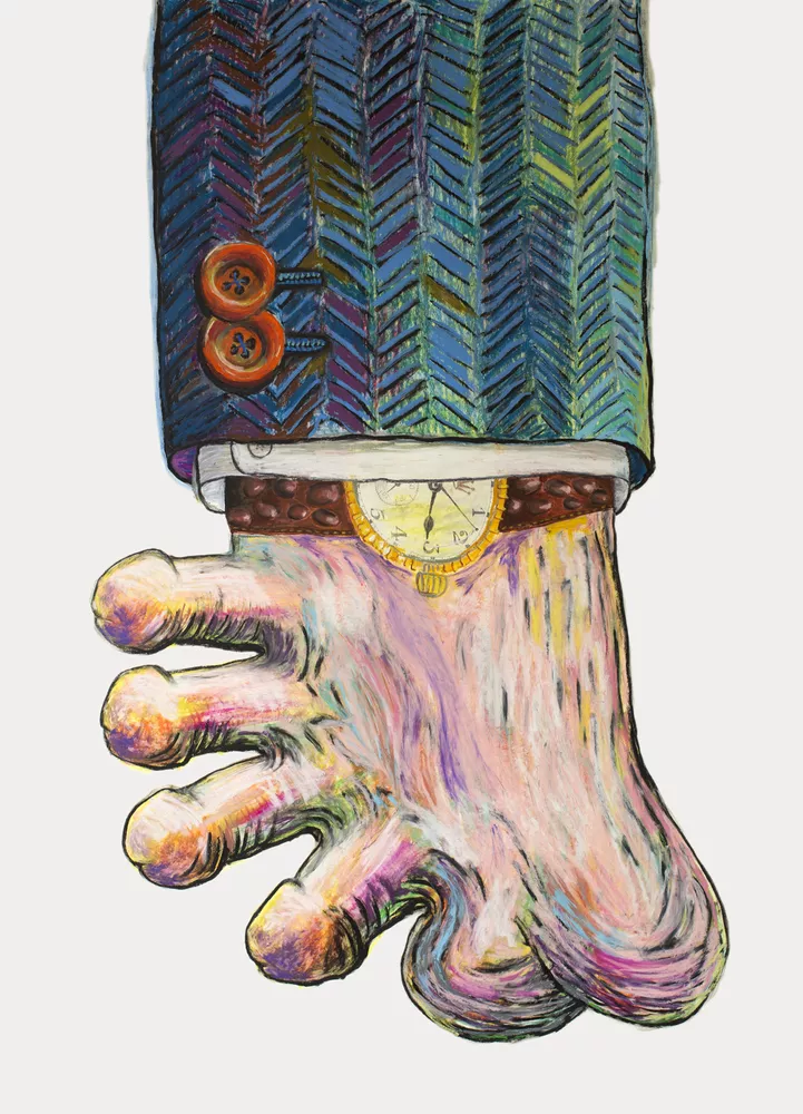 Hand of the State (2017) in which a hand is reaching into the picture from above. The arm of the jacket has a bluish, traditional herringbone pattern with two ochre-coloured buttons. You can see the cuff of a white shirt underneath the jacket with a gold watch peering out from underneath it. Up to this point, the depiction is realistic. The hand merely looks deformed on first take, then you realise that the four, same-sized fingers sticking out to the side are depicted as penises with the suggestion of scrotums where the thumb should be. The colourful composition and fragmentary, deformed depiction of the body, reminiscent in its flesh-coloured and bulky motifs (such as shoes, feet, and hands) of a late Philip Guston painting, again shows authoritarian state power in a different light. The drawing entitled Master of Thieves (2017) also has a gripping hand, this time growing out of a face where the nose should be, the face’s black eye sockets reminiscent of a skull.