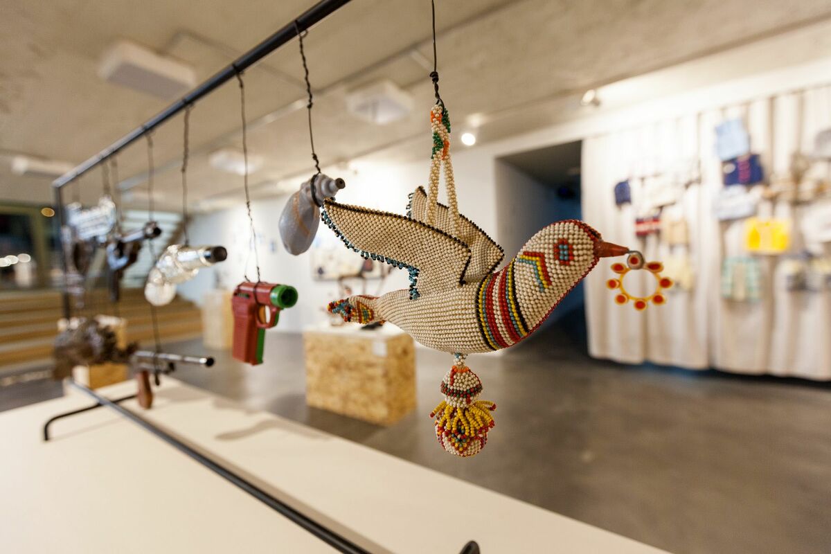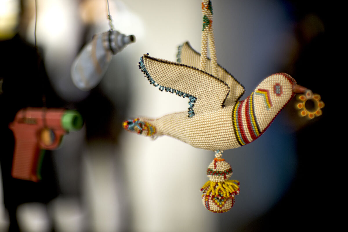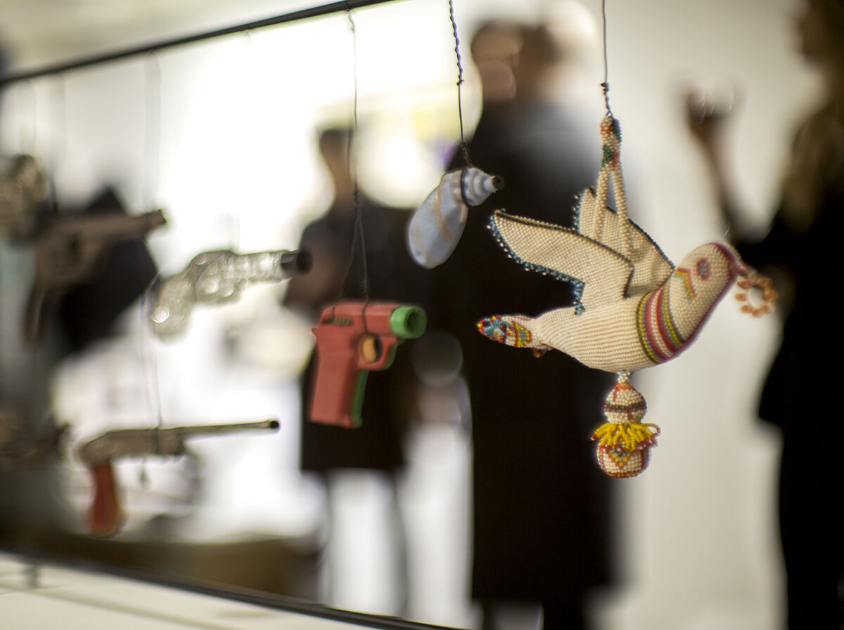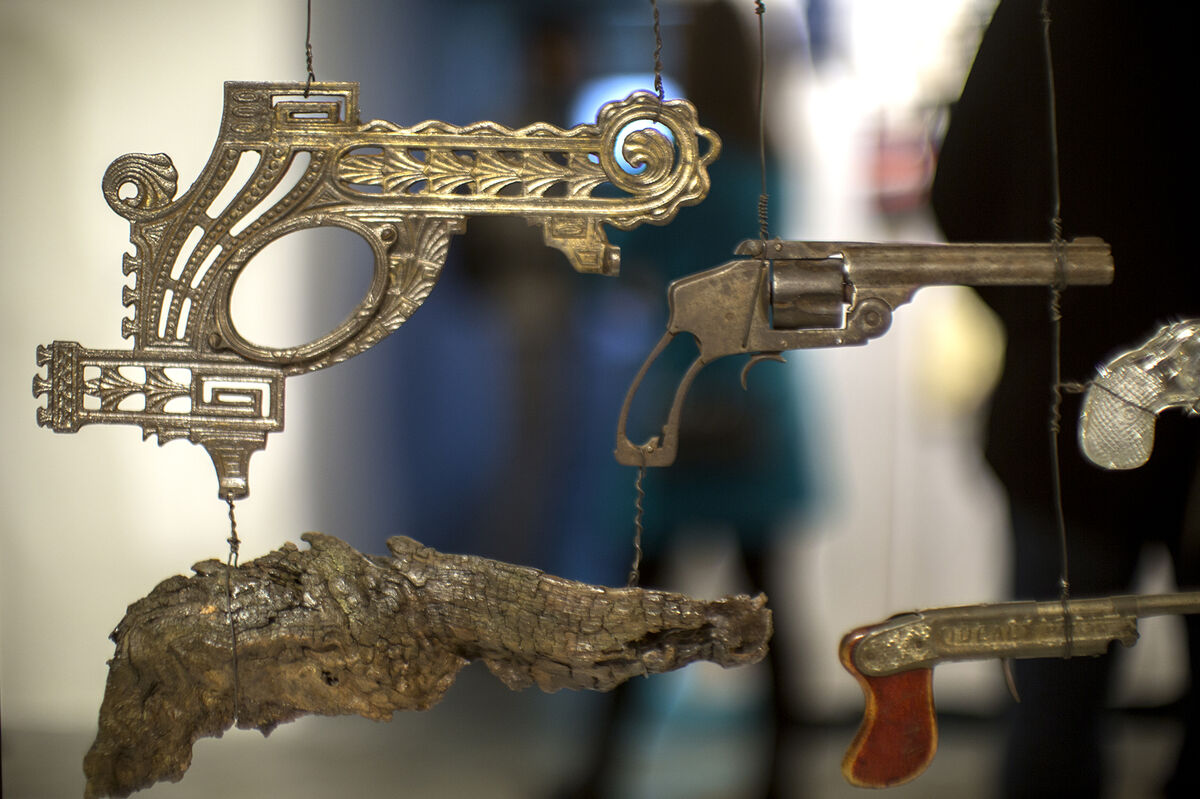 bird figurine made in prison, toy guns, found piece of wood and and a part of a chandelier