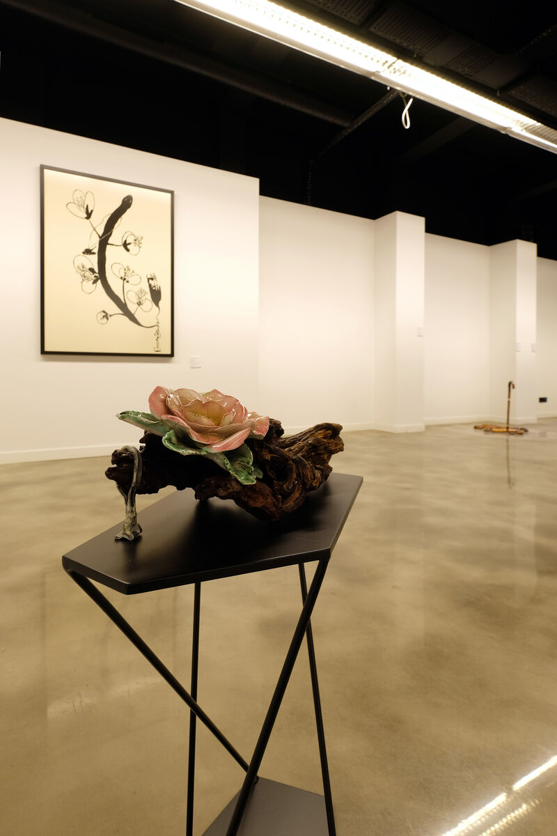 kurumuş kütük, seramik gül ve kurşun ayak a dried log, ceramic rose, lead mount