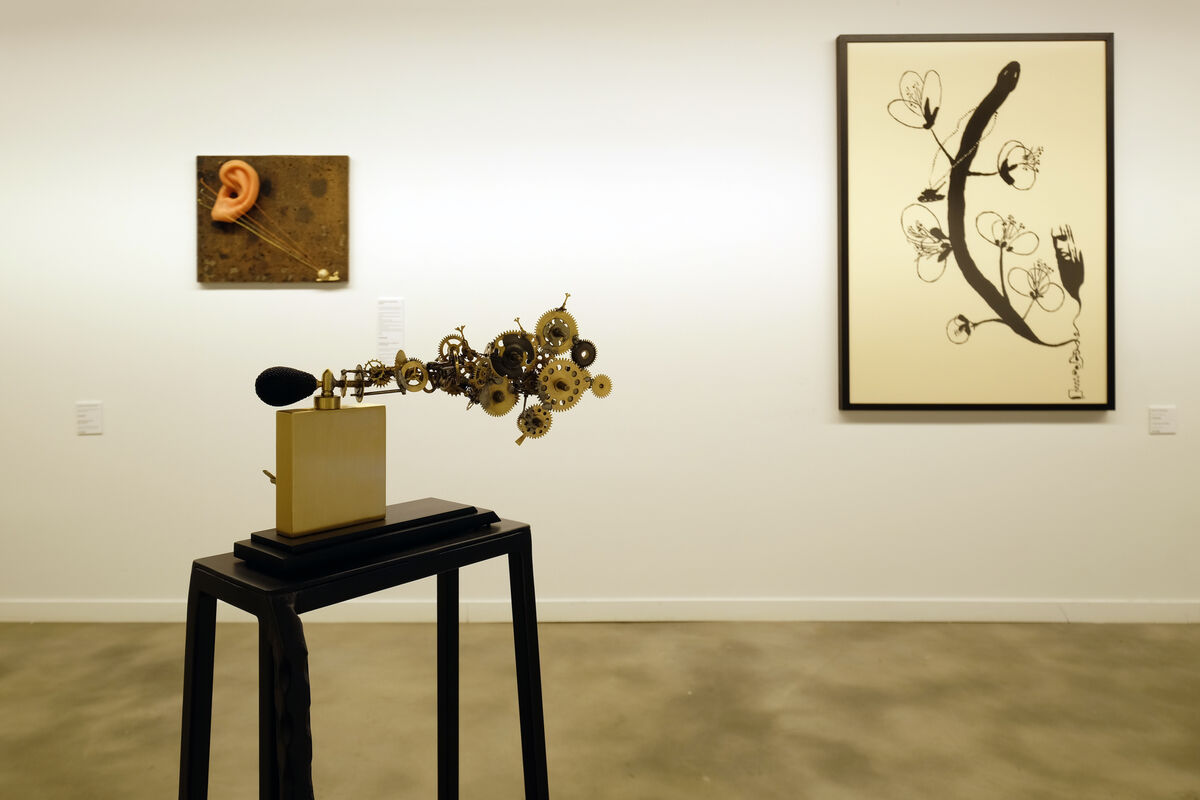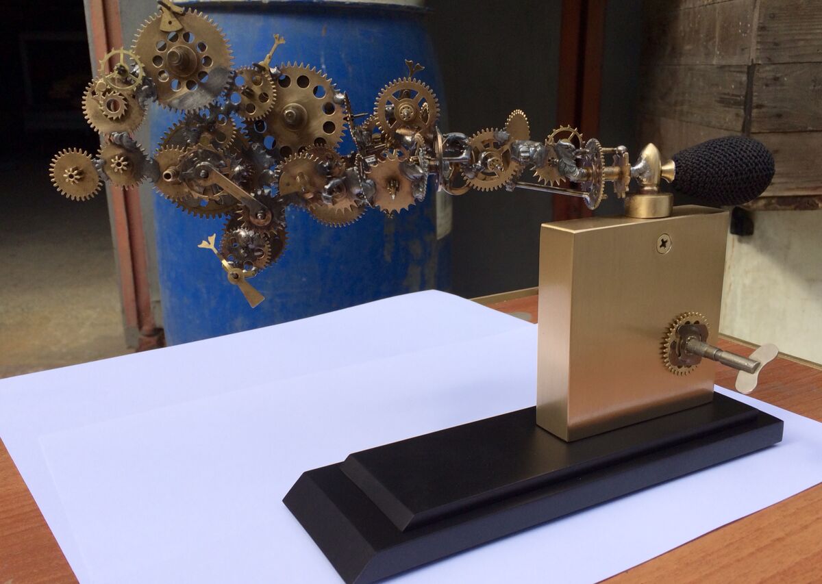 saat çarkları, parfüm pompası, pirinç parfüm şişesi ve siyah demir kaide clockwork devices, perfume pump, brass perfume bottle, black iron pedestal