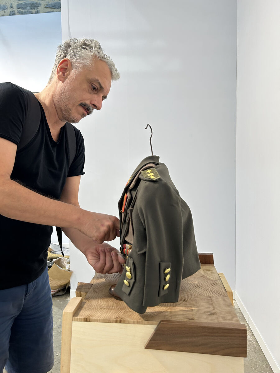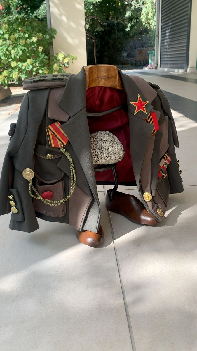 özel dikim asker ceketi ve madalyalar / ayous, huş, ceviz, tik, maun, kestane, ıhlamur ağaçlarından üretilmiş bir kaide coathanger, wooden shoe last, custom made military uniform and medals / plinth made of African whitewood, birch, walnut, teak, mahogany, chestnut tree and linden wood