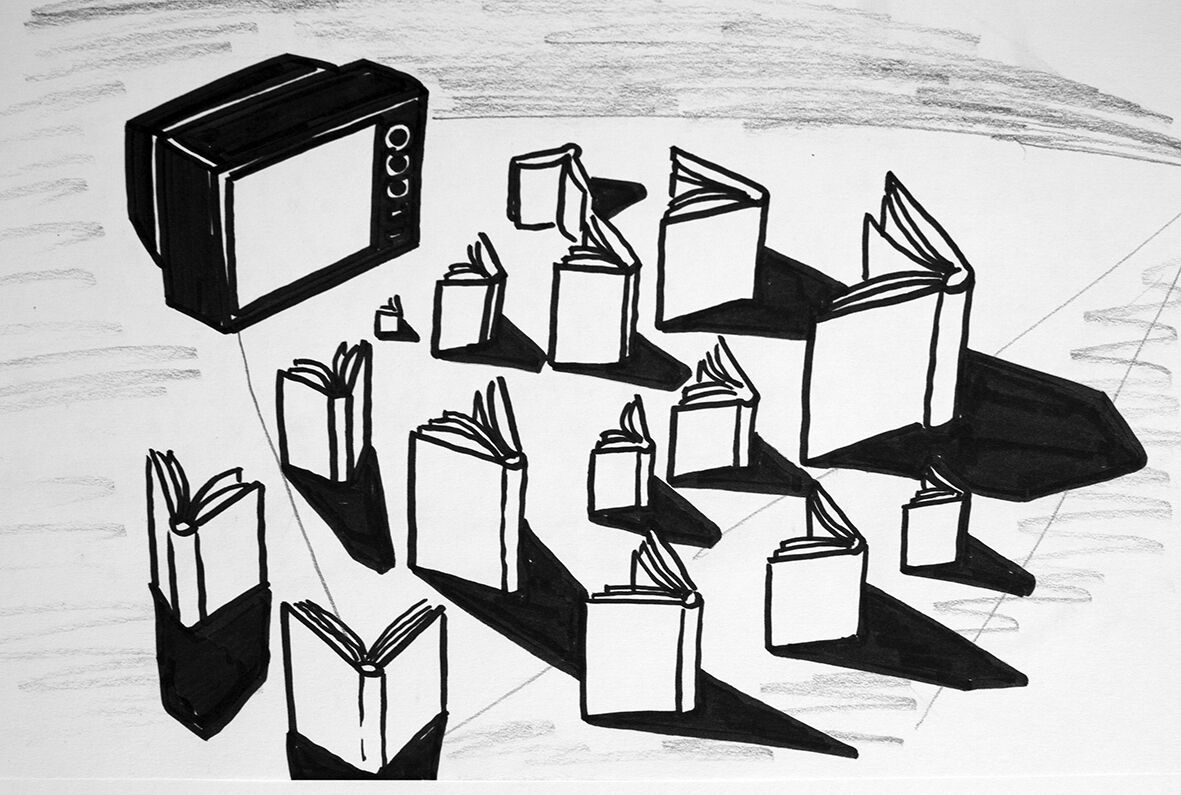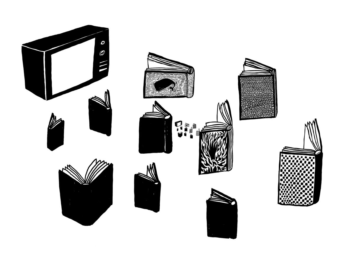 TV-shaped lamp, inspired by handmade Magno radios, spruce and walnut wood, various books